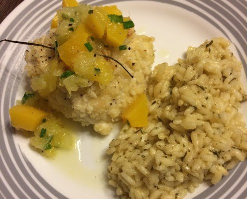 When the fish is flaky and its nut coating is lightly browned, remove from the oven. Top with the tropical salsa, serve, and enjoy!