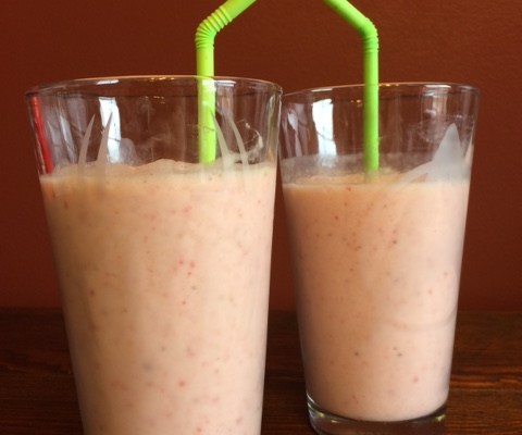 Cut the strawberries and frozen bananas into small chunks and place in a blender. Add the yogurt, juice, and ice. Blend until combined, and enjoy!